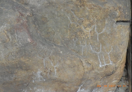 Das Piktogramm weist nun eine kleinere Viererformation dieser total abstrahierten Rinder seitlich von einem Paar deutlich größerer, nicht minder stark stilisierter Rinder mit Jochstrich aus. Dem Paar im Joch zur Seite steht ein Kalbskopf, ergo ein Bukranion. Letzterer ist weniger stilisiert, als die adult wirkenden Rinderfiguren. Beide Rinderformationen streben auf ein kammartiges Objekt im Zentrum des Bildes mit neun Zinken zu. Links und rechts werden die Gespanne von kurzen Wellen- oder Zickzackornamenten flankiert.