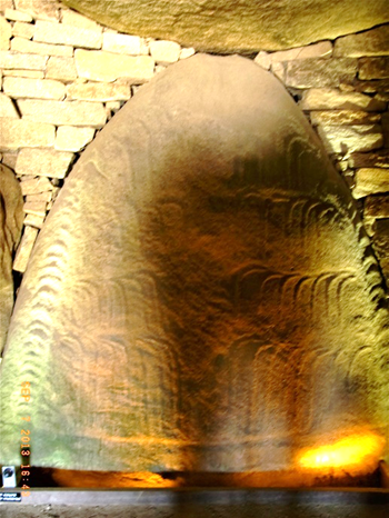 Was das faszinierende Dekor im Inneren angeht, künstlerisch wie motivisch, lässt sich Gavrinis bestenfalls mit dem weltberühmten Kuppelganggrab von Newgrange und mit dessen Nachbaranlagen Knowth und Dowth in Irland vergleichen. Für Newgrange gilt selbst das nur, bezieht man die dekorierten Randsteine (engl.: Kerbstones) seiner äußeren Hügeleinfassung ein. Der berühmte, dekorative Eingangsstein von Newgrange (Kerbstone 1) mit seinen Wellen- und Rautenmotiven könnte, von der Qualität seiner Gravuren her, geradewegs aus Gavrinis stammen. Allerdings fehlt das für die irische Ganggrabkultur typische Motiv der Raute in der bretonischen Anlage weitgehend. Auch Spiralmuster, für die Newgrange so berühmt ist, finden sich in Gavrinis höchstens ansatzweise innerhalb der konzentrischen Kreis- und Bogenformationen. Andersherum vermisst man dort die Beilklingenmotive, die in Gavrinis gleich auf mehreren Orthostaten zu finden sind. Newgrange wurde erst im späten 4. Jt. v. Chr. errichtet.9 Andererseits zeugen die Gravuren in Gavrinis insgesamt von einer filigraneren Gravurtechnik. Die subtilere Ausführung ermöglichte, so mein subjektiver Eindruck, im Vergleich mit den irischen Kunstwerken wesentlich kompaktere Bildzeugnisse pro Stein. Gerade diese geballte, enge Linienführung macht Gavrinis so erstaunlich, zu einer ebenso ästhetisch wie rätselhaft wirkenden Steinzeitgallerie.